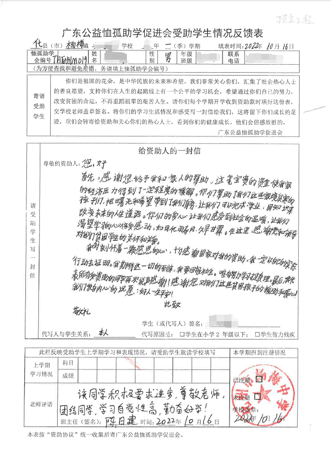2022年7月,公司了解到广东公益恤孤助学促进会举办慈善助学活动之后,发起了公司内部慈善捐款活动,员工们积极参与,纷纷捐款,向有需要的学生奉献爱心,向他们表达一份关爱。也许我们的爱心微不足道,但却缓解了他们在学业上一定程度的经济压力,改善了他们的学习和生活环境,也给他们带来了希望。近期,广东公益恤孤助学促进会将学生情况反馈表及受助学生对捐助人的一封信邮寄到公司,反馈了受助学生的学习生活情况,反馈表及信函里记录着受助学生对学习的热爱,也表达着他们对捐助人的感激之情,可以说我们小小的举动给他们带来了莫大的支持。